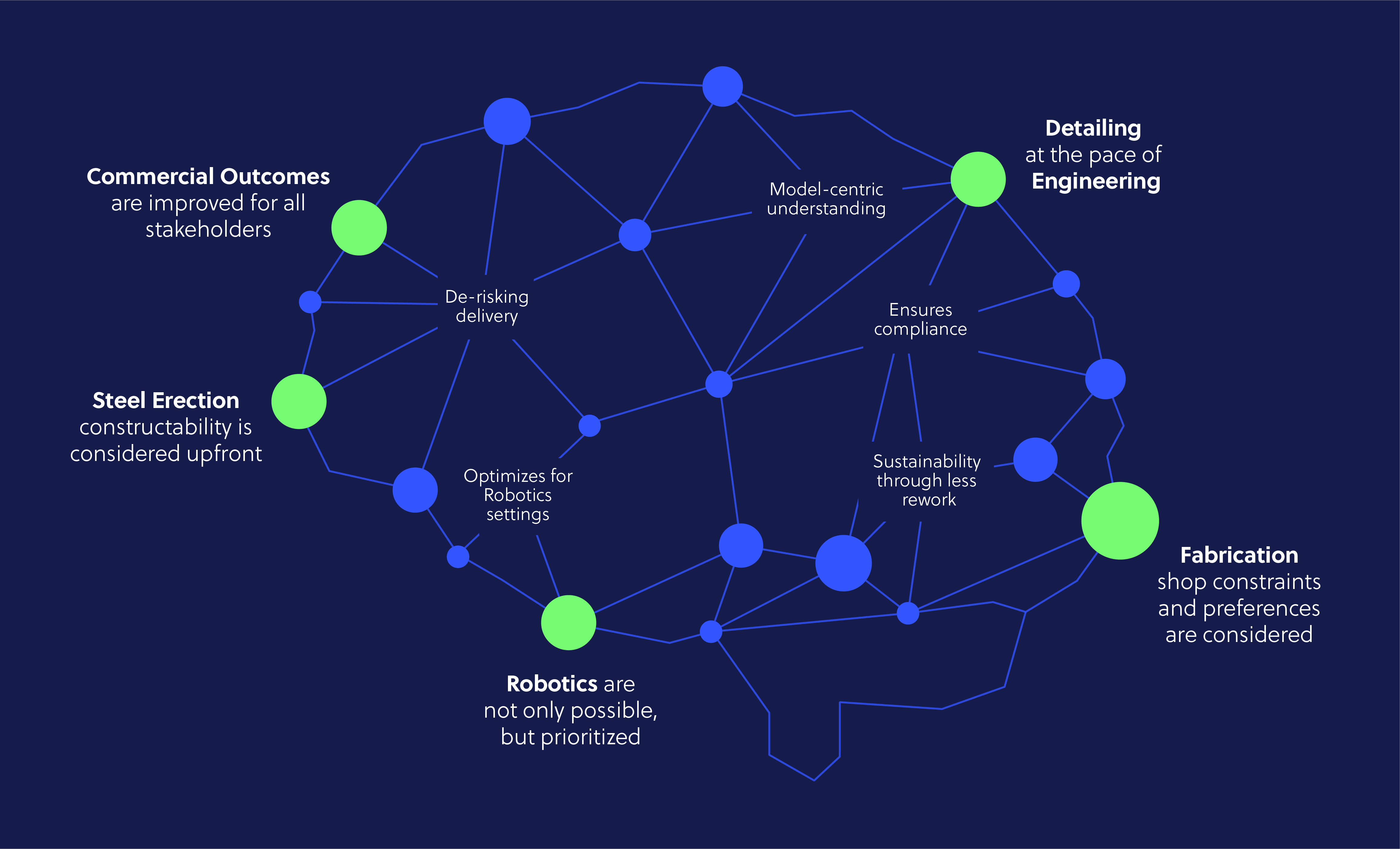 Construction intelligence is an infrastructure layer that connects the fragmented structural steel workflow. It is powered by a Steel Brain, an AI engine purpose-built for structural steel.